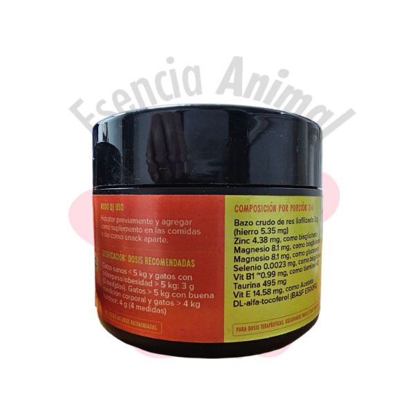 - Bazo crudo de res liofilizado: 3 g (hierro 5.35 mg)